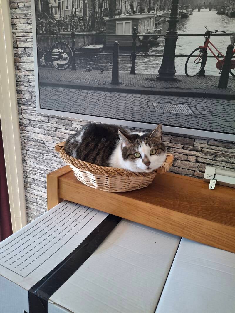 Kom je een pakketje brengen in Pieterburen zie je de kat in het mandje liggen (door ons gegeven) van het kerstpakket 2024. Hoe leuk is dat?
