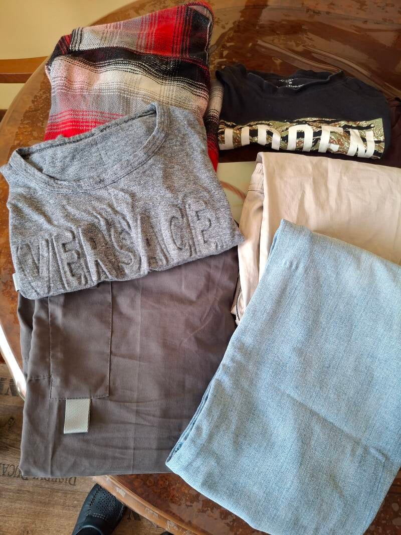 Auto volgeladen en rond gebracht met 6 tassen met kleding en een tas met schoenen.
